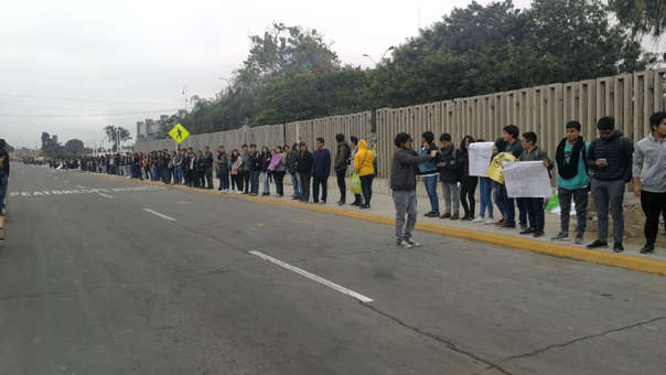Los alumnos hicieron una cadena de entre 400 y 500 metros de largo -aproximadamente desde la puerta N°3 hasta la N°6- pasado el mediodía, justo después de que se venciera el plazo que les dio el rector, Orestes Cachay, para que abandonen pacíficamente las instalaciones.