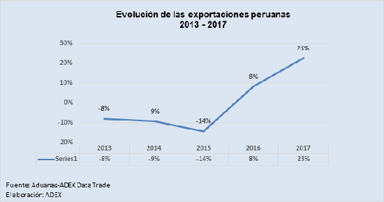 Lima. – Debido a un mejor desempeño de los minerales y de la agroindustria, las exportaciones peruanas crecieron en el 2107 por segundo año consecutivo, cerrando en US$ 44 mil 058 millones, lo que representó un incremento de 22.7%, respecto al 2016, informó la Asociación de Exportadores (ADEX).