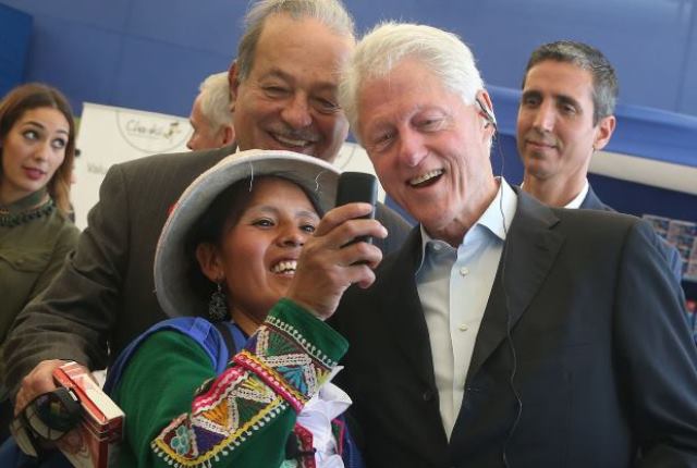 Durante la visita que efectuó Bill Clinton al proyecto social Chakipi, una beneficiaria no desaprovechó la oportunidad para tomarse un selfie con el expresidente norteamericano y el magnate mexicano Carlos Slim.