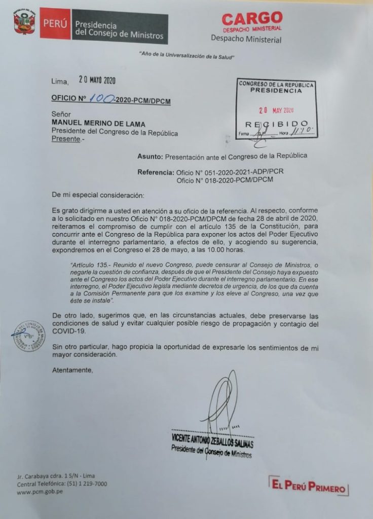“Reiteramos el compromiso del Ejecutivo para cumplir con el artículo 135 de la Constitución, para concurrir ante el Congreso de la República para exponer los actos del Poder Ejecutivo durante el interregno parlamentario”, señala la comunicación.
