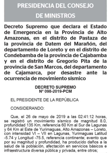 El Decreto Supremo N° 098-2019-PCM declara esta medida de excepción en toda la provincia de Alto Amazonas, la más afectada por el fuerte movimiento telúrico. También en el distrito loretano de Pastaza, ubicado en la provincia de Datem del Marañon.