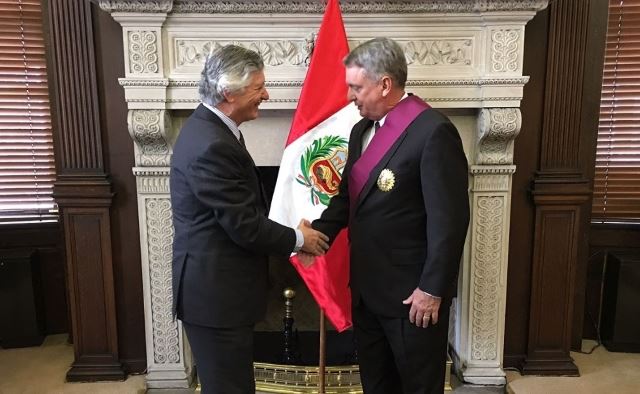 La más alta distinción que otorga el Estado Peruano, le fue entregada por el embajador del Perú en Estados Unidos de América, Carlos Pareja Ríos, en ceremonia protocolar desarrollada en la sede diplomática peruana en Washington D.C.