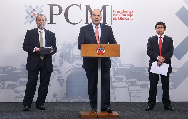 En la conferencia de prensa, el jefe del Gabinete Ministerial estuvo acompañado por el ministro de Vivienda, Construcción y Saneamiento, Edmer Trujillo Mori, y el viceministro de Gestión Institucional del Ministerio del Interior, Ricardo Valdés