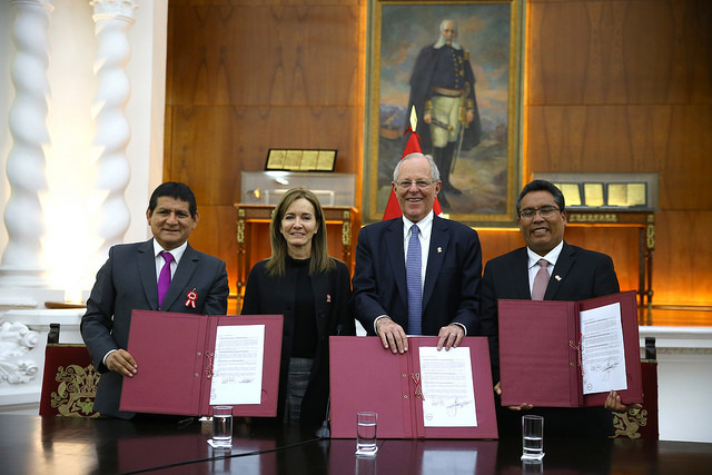 El presidente Pedro Pablo Kuczynski y la ministra de Educación Marilú Martens, tras la firma del convenio con los gobernadores regionales Ángel Unchupaico (Junín) y Rubén Alva (Huánuco), para la aplicación de este nuevo modelo educativo.