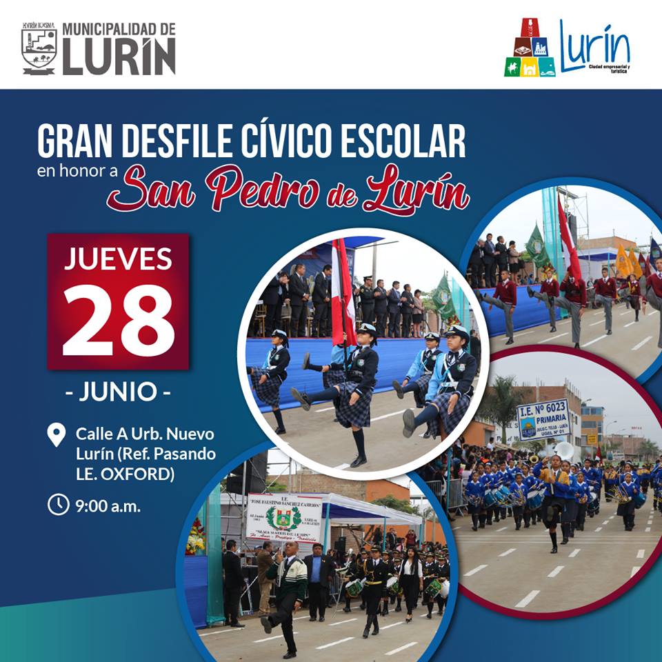 Uno de los eventos sera el Desfile Cívico Escolar en Honor al Santo Patrón San Pedro de Lurín que se realizará el jueves 28 de junio.