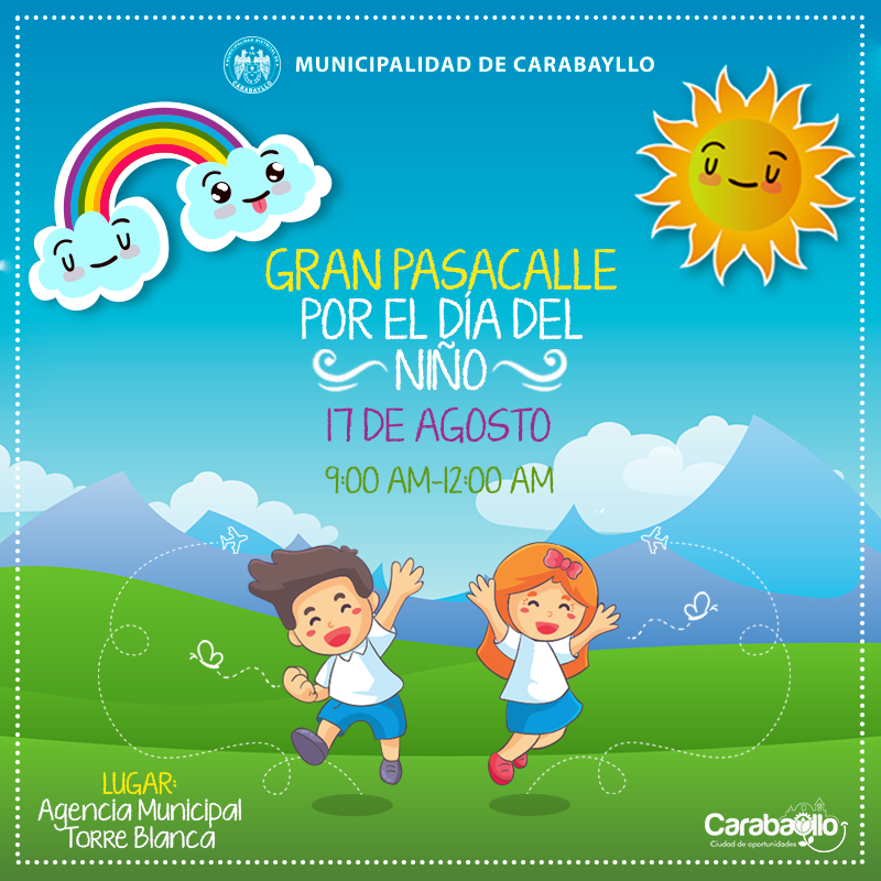 Te invitamos a participar de este gran pasacalle y show infantil por la celebración del “Día del Niño” en el distrito de Carabayllo este 17 de agosto donde habrá un show infantil muy divertido para los niños que asistan.
