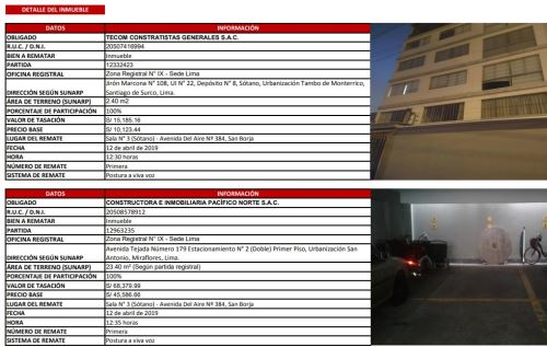 Entre los inmuebles a rematar se encuentran: departamentos, locales comerciales, casas, edificios, estacionamientos, por un valor ascendente a S/ 7.4 millones.
