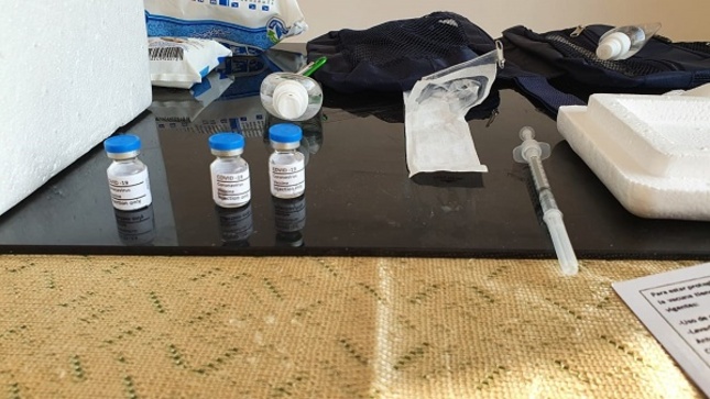 Se incautó una caja de tecnopor color blanco, conteniendo en su interior dos bolsas de hielo con las inscripciones gel pack “Mantiene baja Temperatura – Reemplaza al Hielo”, tres frasquitos de vidrio trasparente con tapas de color azul, con inscripción Covid – 19 “Corona Virus, Vaccine, Innjection Only (supuestas vacunas), un maletín de color azul, conteniendo en su interior, jeringas, gasa, tijera y un carnet de vacunación contra Covid – 19, cinco billetes de 100 soles, producto del pago y tres celulares.