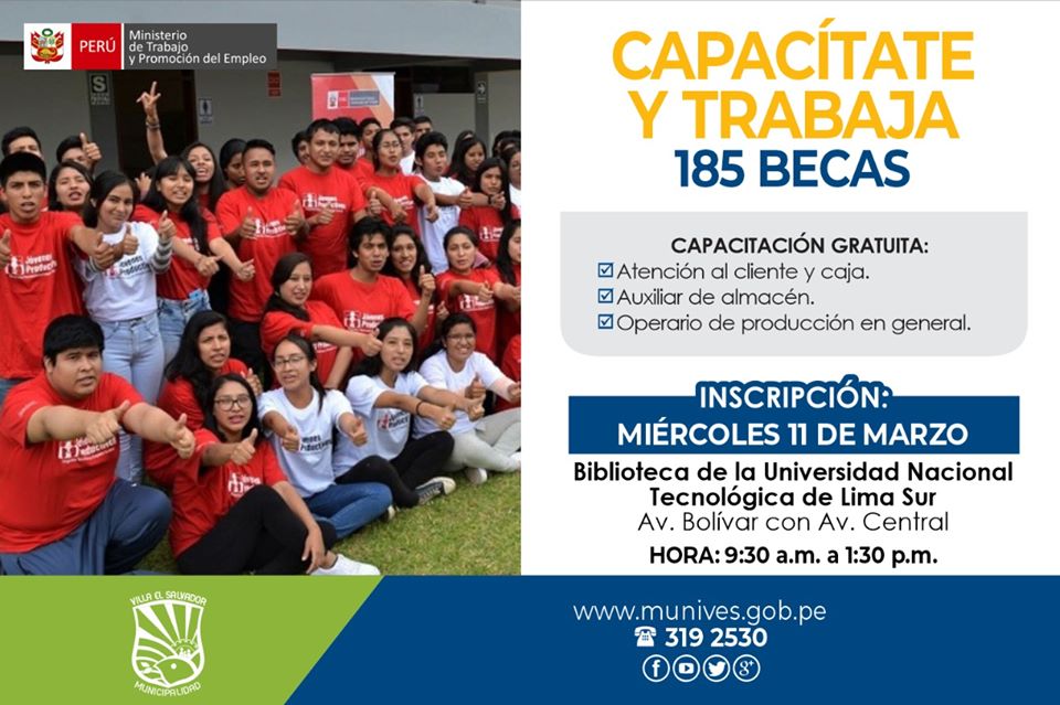 #VillaJoven | Con el objetivo de fortalecer el desarrollo de los jóvenes del distrito, la Municipalidad de Villa El Salvador, en coordinación con el Programa Jóvenes Productivos del Ministerio de Trabajo y Promoción del Empleo, ofrecen 185 becas gratuitas de capacitación: