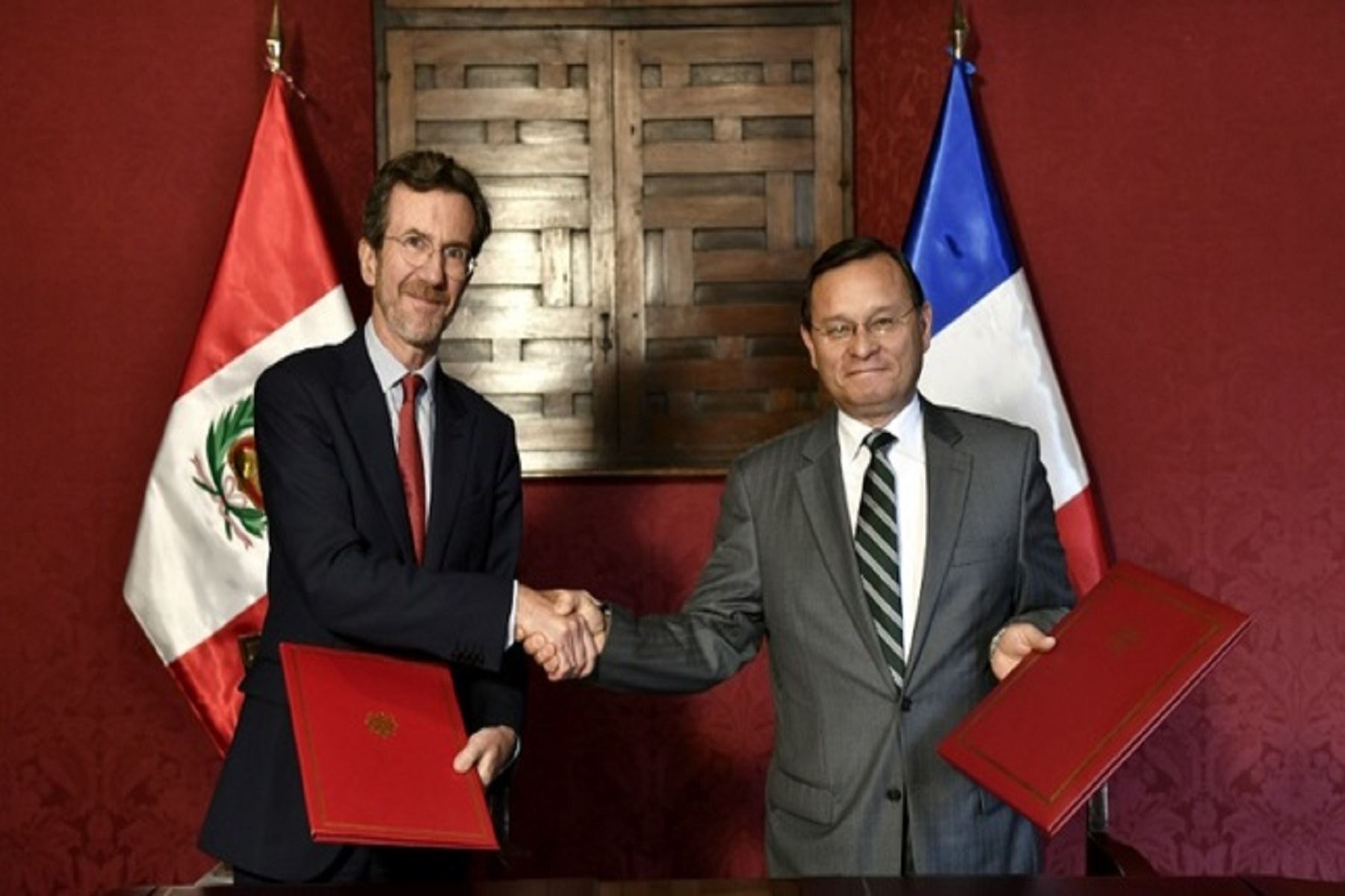 El ministro de Relaciones Exteriores del Perú, Néstor Popolizio, y el Embajador de Francia en el Perú, Antoine Grassin, suscribieron hoy un Acuerdo para el establecimiento del Programa “Vacaciones y Trabajo”.