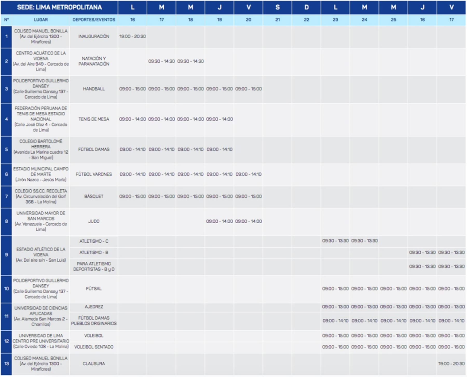 En tanto, la Universidad de Lima, UPC Chorrillos, los polideportivos Guillermo Dansey y Manuel Bonilla y los colegios Bartolomé Herrera y La Recoleta, también serán sedes.