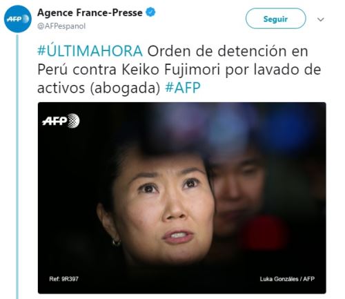 La agencia española Efe informó al mundo: “Detienen a Keiko Fujimori por pedido de Fiscalía de Lavado de Activos de Perú”.
