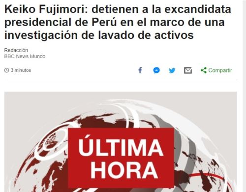 Los principales medios de comunicación del mundo informan sobre la detención preliminar contra la ex candidata presidencial de Fuerza Popular, Keiko Fujimori, a pedido de la Fiscalía de Lavado de Activos de Perú.