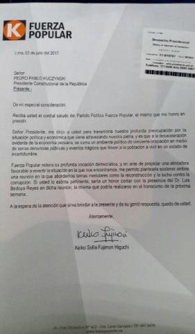 La lideresa de Fuerza Popular. Keiko Fujimori, envió carta al presidente Pedro Pablo Kuczynski expresando su preocupación por la situación política y económica que viene atravesando el país, por lo que le propone reunirse.