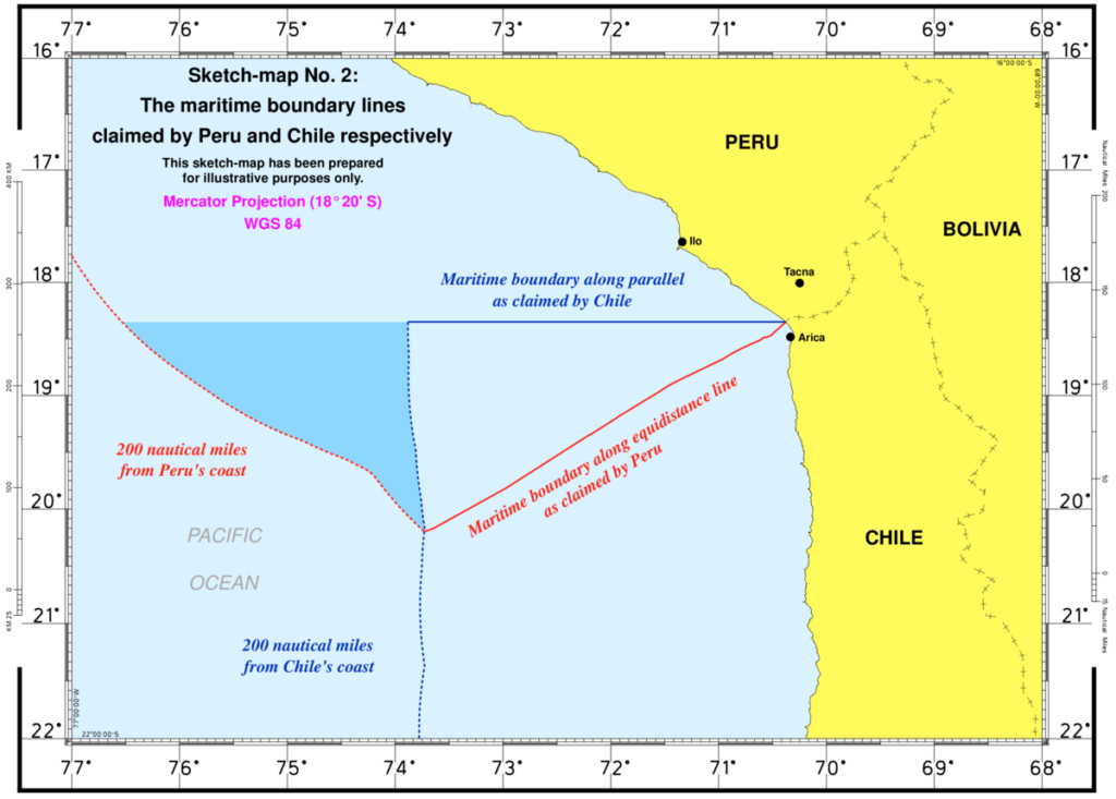 02.- Chile, por su parte, consideró la demanda como un acto inamistoso, y alegaba que los límites marítimos bilaterales ya habían sido fijados en tratados suscritos en la década de 1950, que según la posición oficial del Perú eran solo acuerdos pesqueros.