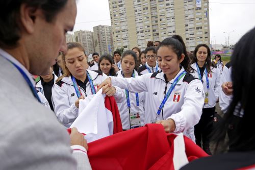 El lunes 22, el presidente Martín Vizcarra, hizo la entrega oficial del pabellón nacional a la delegación peruana en el Palacio de Gobierno. Kevin Martínez, de Paleta Frontón, fue el encargado de recibir la bandera.