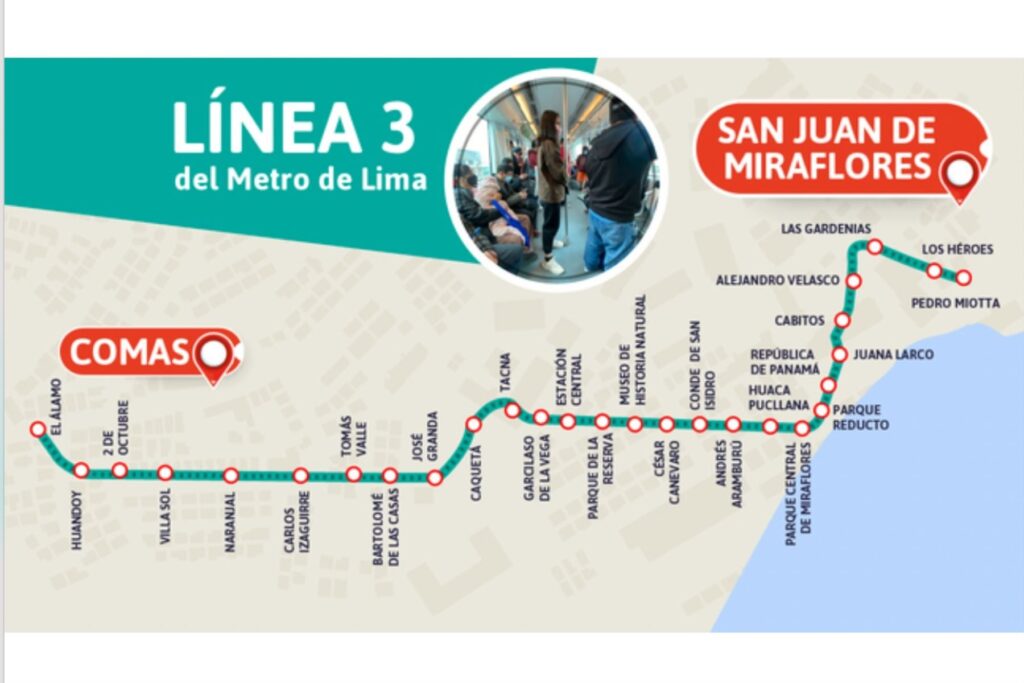 La Línea 3 del Metro de Lima será completamente subterránea, recorrerá 34.8 kilómetros y atravesará 12 distritos: Comas, Los Olivos, Independencia, San Martín de Porres, Rímac, Cercado de Lima, Jesús María, Lince, San Isidro, Miraflores, Santiago de Surco y San Juan de Miraflores.