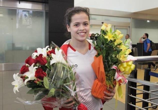 Familiares y representantes del IPD recibieron con flores a la joven gimnasta peruana Ariana Orrego, de apenas 17 años de edad, a su llegada al aeropuerto Jorge Chávez.