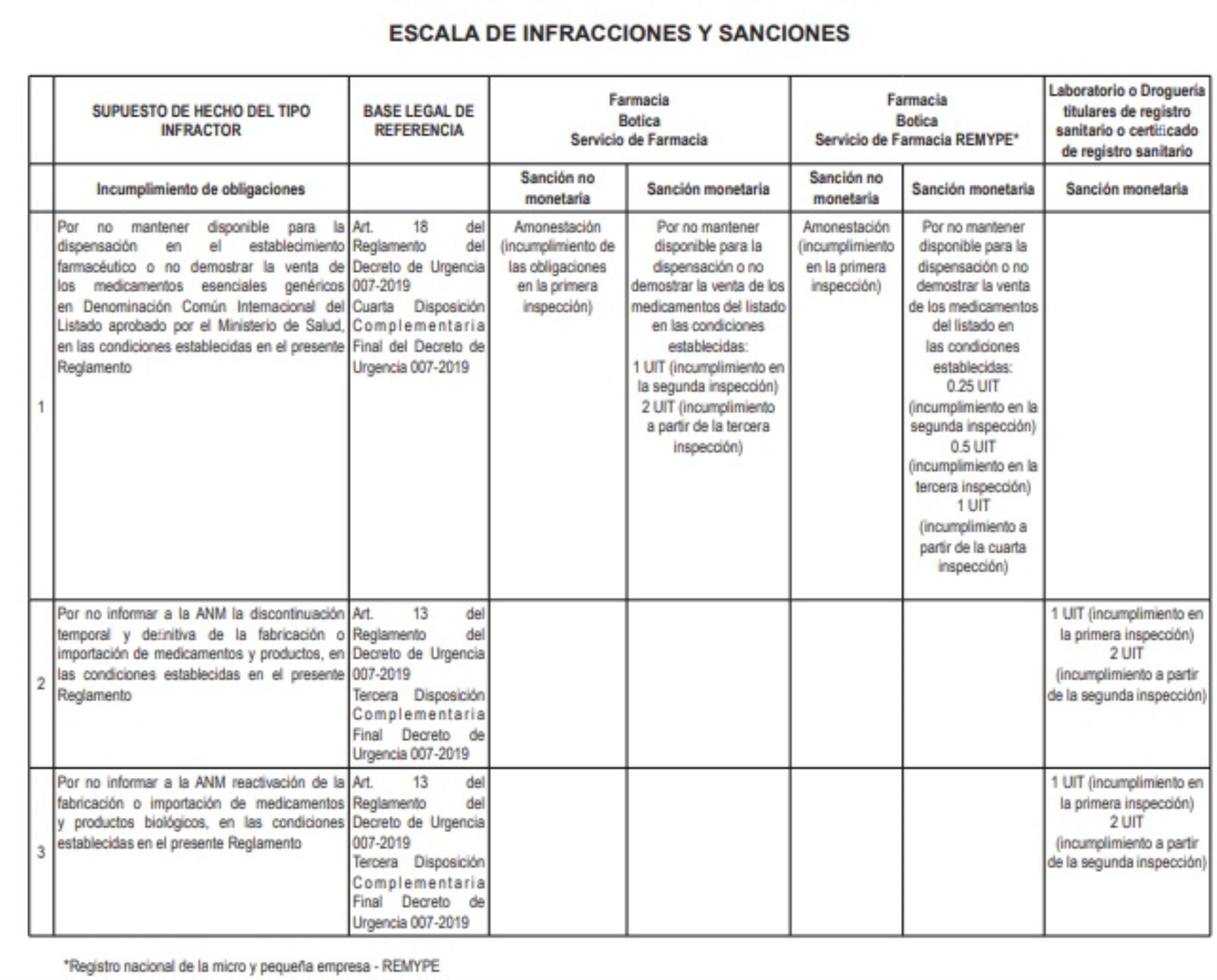En el caso de farmacias que son microempresas, la escala de sanciones es como sigue: 0.25 UIT (incumplimiento en la segunda inspección) 0.5 UIT (incumplimiento en la tercera inspección) y 1 UIT (incumplimiento a partir de la cuarta inspección).