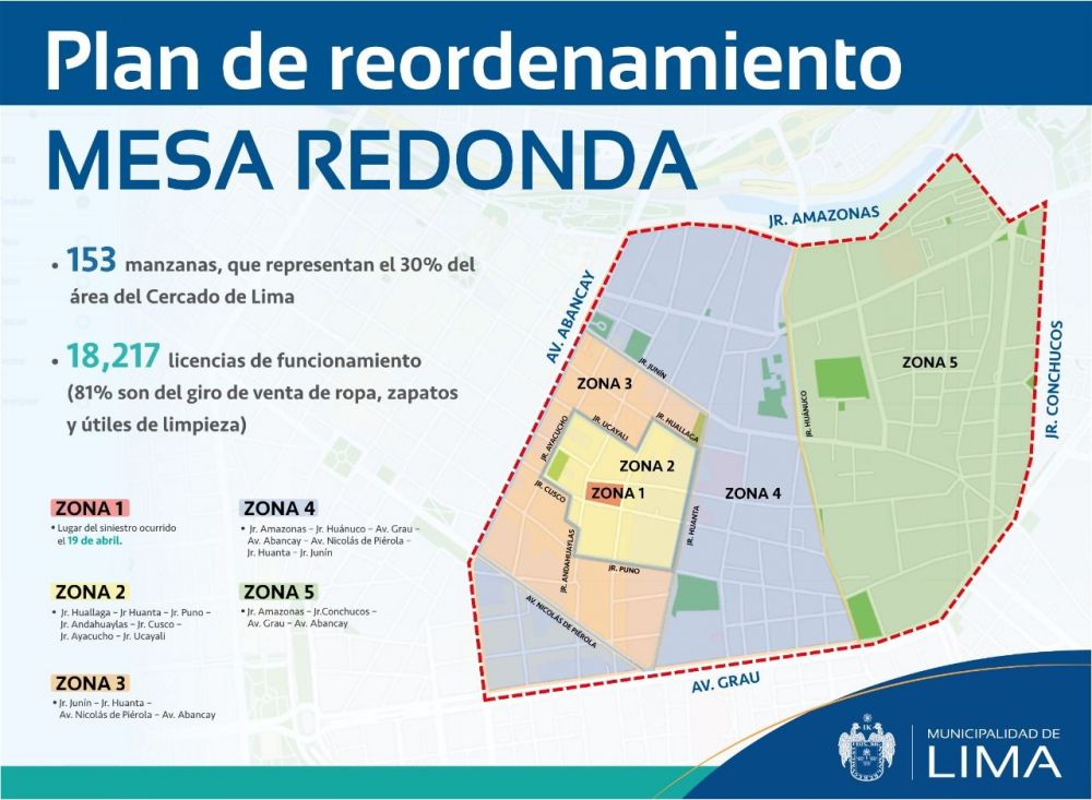 La Municipalidad Metropolitana de Lima publicó hoy la ordenanza N° 2159 que suspende por 30 días las licencias de funcionamiento de locales comerciales ubicados en 29 cuadras del sector de Mesa Redonda y el Mercado Central, en el Cercado de Lima. La medida se ejecutará tras el incendio ocurrido el 19 de abril y que consumió más de 30 inmuebles.