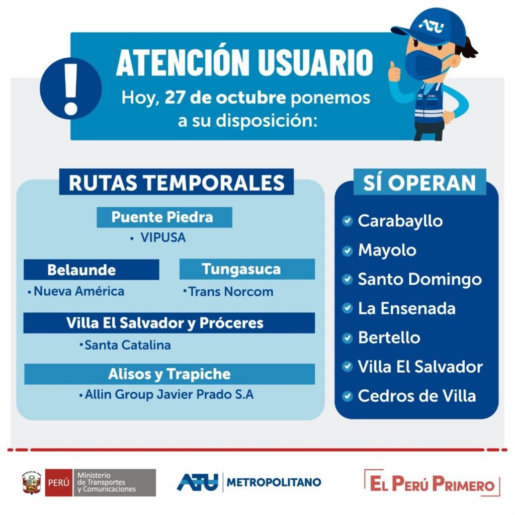 Valenzuela informó que, paralelamente, la ATU incrementó la cantidad de servicios temporales que cubren la demanda de las rutas alimentadoras del Metropolitano que dejaron de operar, a fin de garantizar la movilidad de los usuarios de la zona norte y sur de Lima.