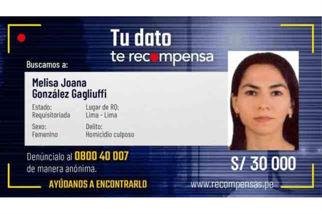El Ministerio del Interior (Mininter) incluyó en el Programa de Recompensas a Melisa Joana González Gagliuffi (36), sentenciada a seis años de prisión por arrollar con su camioneta a tres jóvenes que circulaban por la Av. Javier Prado, causando la muerte de dos de ellos.