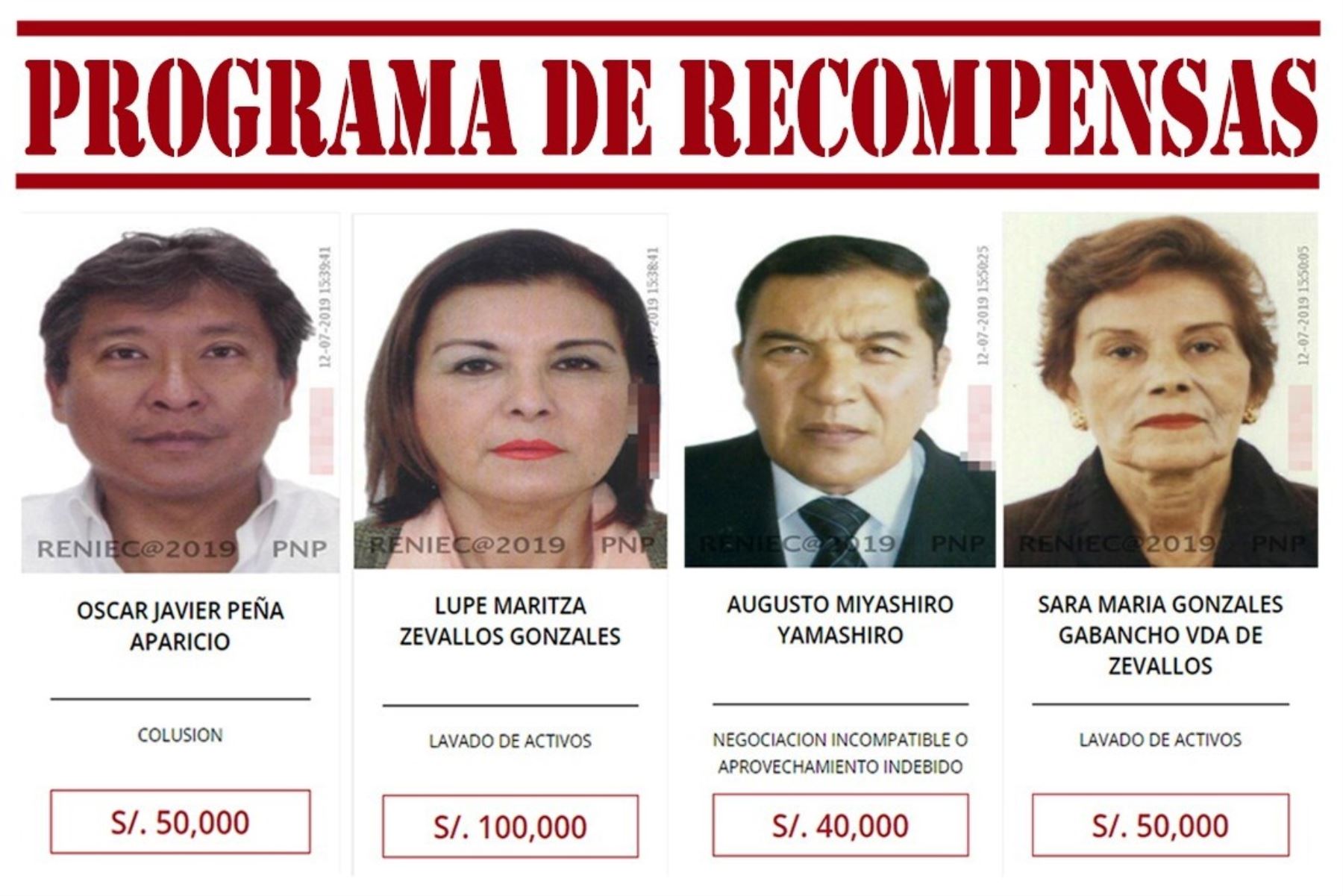 De la misma forma, se ofrece una recompensa de S/ 50,000 para Peña Aparicio, condenado a cinco años de cárcel por el delito de negociación incompatible, según el fallo del Primer Juzgado Unipersonal del Callao, emitido el 17 de enero de este año.