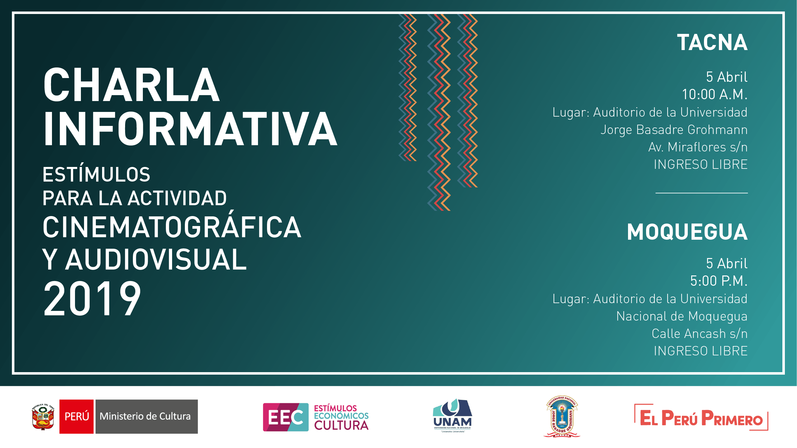 La Dirección del Audiovisual, la Fonografía y los Nuevos Medios (DAFO) en coordinación con la Dirección Desconcentrada de Cultura de Tacna (DDC Tacna) y la Dirección Desconcentrada de Cultura de Moquegua (DDC Moquegua), como parte de sus acciones para el  fomento del fortalecimiento de capacidades y la profesionalización de emprendedores culturales y agentes del sector cinematográfico organizan la “Charla Informativa: Estímulos para la actividad cinematográfica y audiovisual 2019” con el objetivo exponer acerca de la variedad de estímulos económicos para la actividad cinematográfica y audiovisual disponibles el presente año, además de dar información sobre otro tipo de apoyos como convocatorias a espacios de formación, articulación institucional, cartas de respaldo, entre otros.