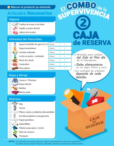 Por otro lado, el Indeci recomienda preparar una caja de reserva, la cual estará implementada con artículos para usar del segundo al cuarto día de la emergencia y debe almacenarse en un lugar fresco y seco.
