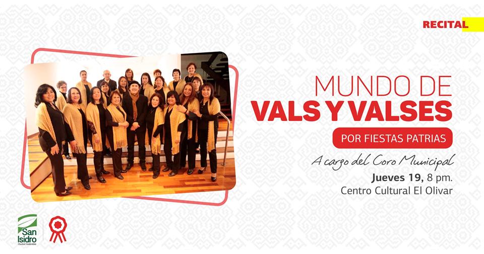 El Coro Municipal de San isidro, formado por los vecinos de nuestro distrito, amantes del canto coral, bajo la dirección del maestro Jairo A. Zuleta Martínez, nos invitan al su Recital “Mundo de vals y valses”, que se realizará por la celebración de las Fiestas Patrias 2018.
