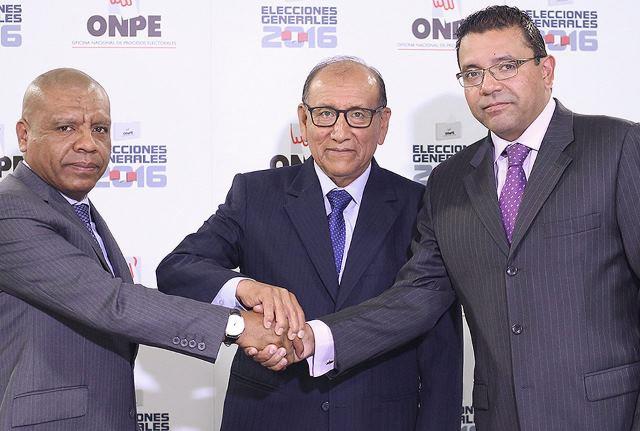El jefe de la ONPE, Mariano Cucho Espinoza, sostuvo una reunión informativa con los personeros Julio Mejía Lecca (Fuerza Popular) y Carlos Portocarrero Mendoza (Peruanos por el Kambio).