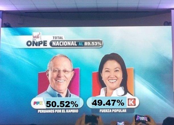 ONPE: Oficial al 89.53% de actas Kuczynski 50.52% y Fujimori 49.47%