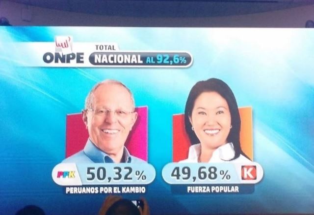 Lima, 06 junio (Peruanosnews.com).- La Oficina Nacional de Procesos Electorales (ONPE) dio a conocer esta mañana que al 92.55% de las actas procesadas, el candidato Pedro Pablo Kuczynski de Peruanos por el Kambio obtiene el 50.32% de los votos válidos y la candidata Keiko Fujimori de Fuerza Popular el 49.68%.