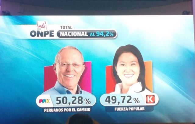 Lima, 06 junio (Peruanosnews.com).- El jefe de la Oficina Nacional de Procesos Electorales (ONPE), Mariano Cucho, informó esta tarde que al 94.2% de las actas procesadas, el candidato Pedro Pablo Kuczynski de Peruanos por el Kambio obtiene el 50.28% de los votos y la candidata Keiko Fujimori de Fuerza Popular el 49.72%.