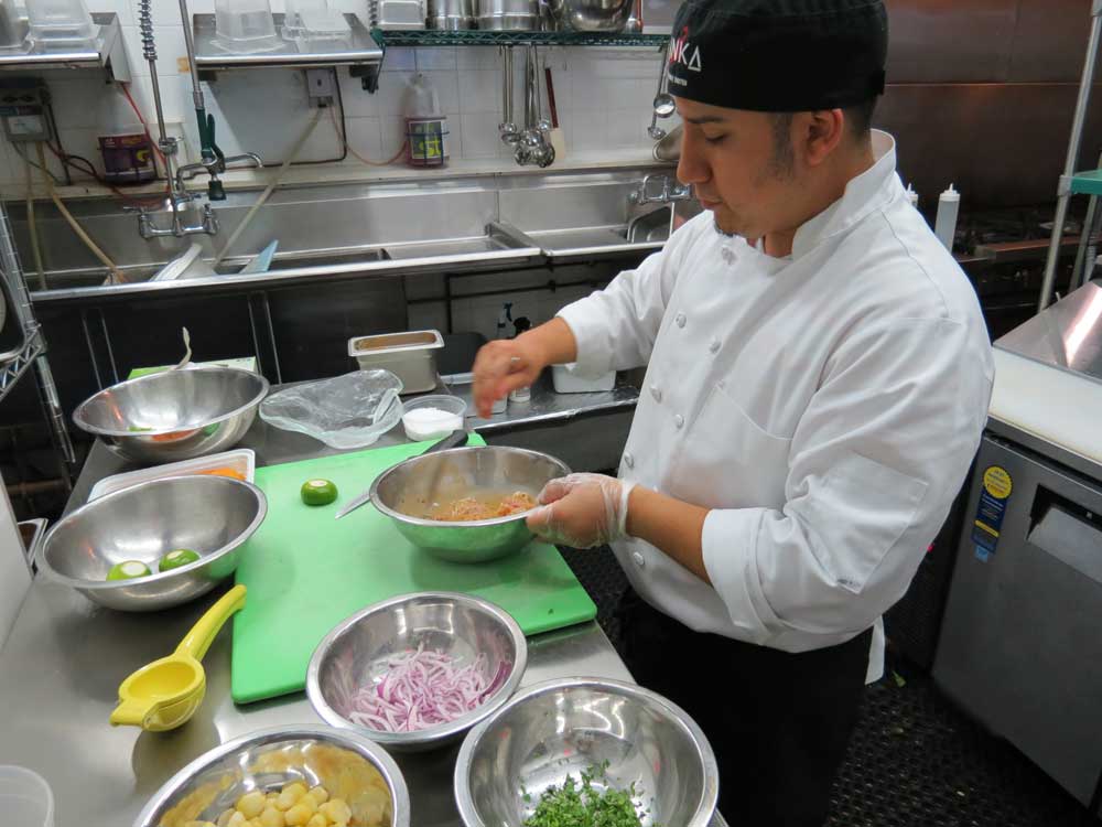 “Es un tiradito muy especial a base de lenguado, papa bien fresca y todos sus ingredientes son de alta calidad”, dijo el joven chef, cuya carrera comenzó desde muy niño, cuando ayudaba a su abuela en la cocina y en vez de jugar con los otros niños de la familia se quedaba fascinado viendo cómo cocinaban las damas de la casa.