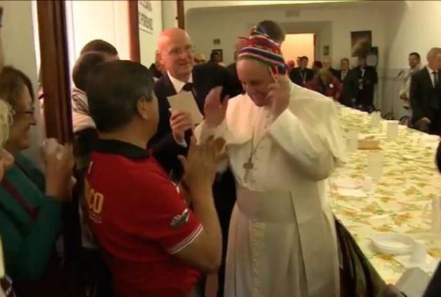 Cuando el Papa Francisco se encontraba saludando a cada uno de los comensales, un compatriota nuestro le alcanzó el chullo de colores y le dijo que “esto es de parte del corazón de todos los peruanos”, gesto que el Santo Padre agradeció con una sonrisa y procedió a colocárselo.