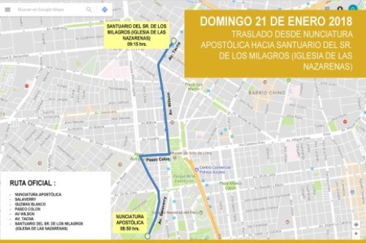 Al día siguiente, el Santo Padre saldrá la Nunciatura para dirigirse al convento de las Nazarenas, adonde debe llegar a las 09:15 horas, siguiendo la ruta Salaverry- Guzmán Blanco- Paseo Colón-Wilson-Tacna.