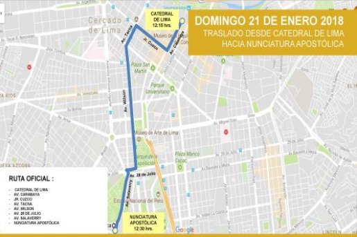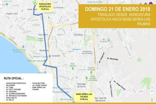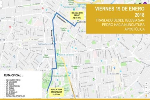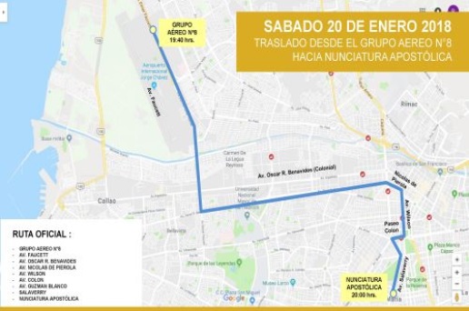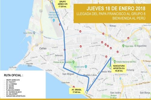 El Santo Padre llegará al Perú, procedente de Chile, el jueves 18 a las 17:20 horas y recorrerá las avenidas Faucett, La Marina, Sucre y Brasil, donde hará una parada para rendirle homenaje a la imagen de la Inmaculada Virgen María que se encuentra al final de esa vía.