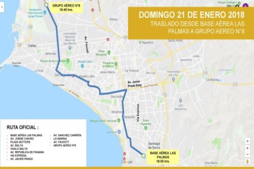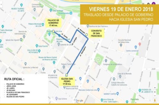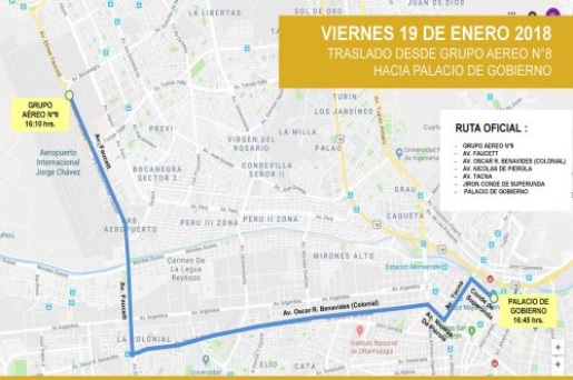 El retorno de Francisco a Lima, luego de cumplir su agenda en Puerto Maldonado, será hacia Palacio de Gobierno. Para ello seguirá por las avenidas Faucett, Colonial, Nicolás de Piérola, Tacna y Conde de Superunda.