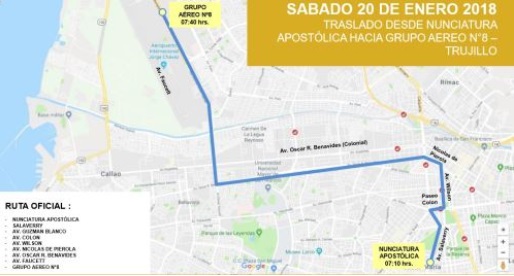 El sábado 20 Francisco cumplirá actividades en la ciudad de Trujillo. Para ello saldrá a las 07:10 horas de la Nunciatura, siguiendo la ruta de las avenidas Salaverry, Guzmán Blanco, Paseo Colón, Wilson, Nicolás de Piérola, Colonial y Faucett hasta llegar al Grupo Aéreo 8.