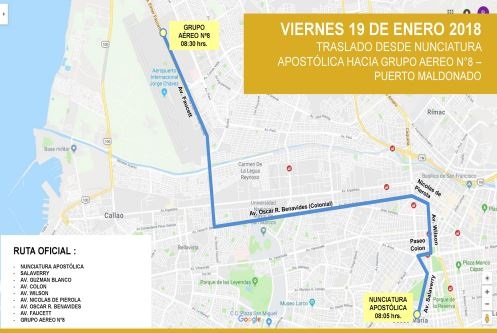 En cuanto al viernes 19, el Santo Padre saldrá al promediar las 08:00 horas para dirigirse al Grupo Aéreo 8 y volar hacia Puerto Maldonado. Con ese propósito irá por las avenidas Salaverry, Guzmán Blanco, Paseo Colón, Wilson, Nicolás de Piérola, Colonial y Faucett.