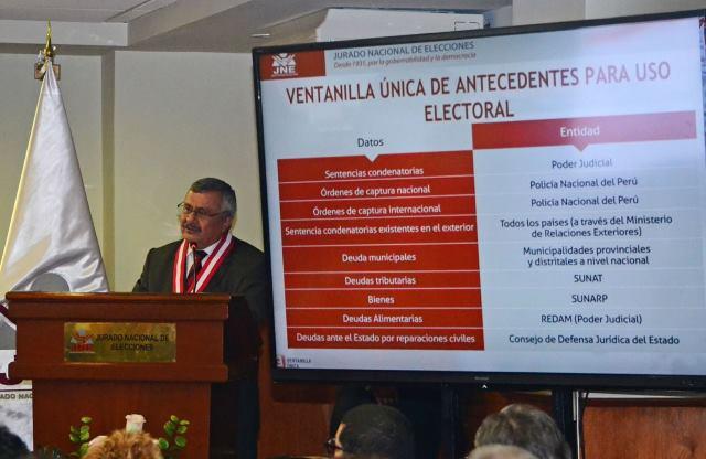 Lima, 29 octubre (peruanosnews.com).- El presidente del Jurado Nacional de Elecciones (JNE), Francisco Távara Córdova, anunció hoy en conferencia de prensa el inicio del funcionamiento de la Ventanilla Única de Antecedentes para Uso Electoral, en donde las organizaciones políticas pueden solicitar información sobre los antecedentes judiciales, policiales y deudas de sus precandidatos y candidatos a las elecciones de 2016.