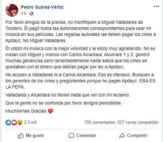 En su texto publicado en Facebook, Pedro Suárez Vértiz empieza de la siguiente manera: “Por favor, amigos de la prensa, no mortifiquen a Miguel Valladares de Tondero. Él pagó todas las autorizaciones correspondientes para usar mi música en sus películas. Las regalías autorales las deben pagar los cines a Apdayc. No Miguel Valladares”.