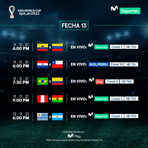 La jornada 13, se disputará entre el jueves 11 y viernes 12 de noviembre y de hecho el partido que generará la atención de los más de 33 millones de peruanos será el que jugará la selección peruana frente a Bolivia, ya que la Bicolor necesita un triunfo para seguir ilusionado en ir al Mundial Catar 2022.