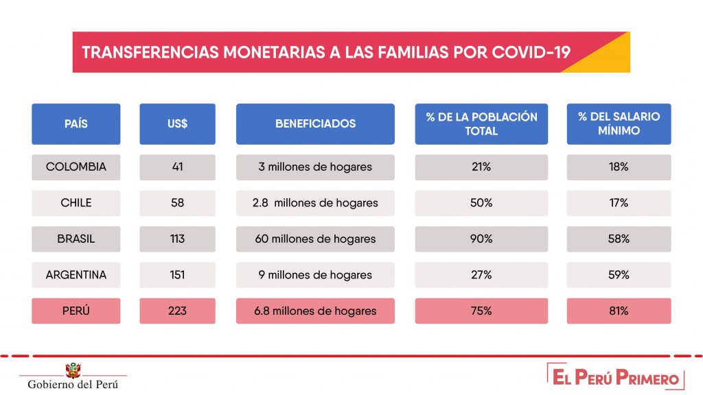 De esta manera, el bono para las familias vulnerables proporcionado en Perú es mayor al que otorgan otros países como Argentina (151 dólares), Brasil (113), Chile (58) y Colombia (41).