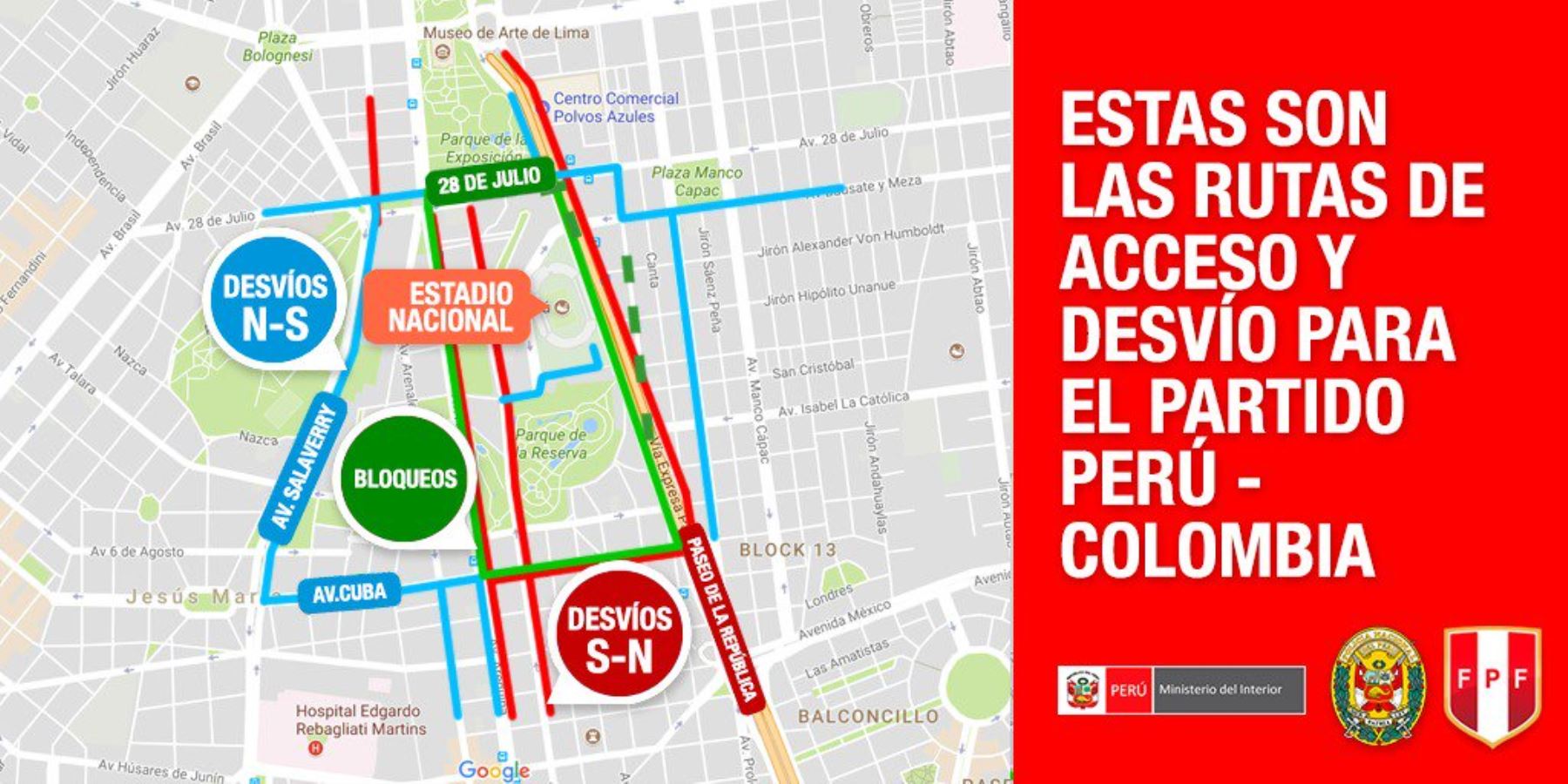 El acceso vehicular a las calles adyacentes al Estadio Nacional estará restringido desde las primeras horas del martes 10, a fin de facilitar el desplazamiento y velar por la seguridad de los hinchas que asistan al partido Perú-Colombia, informó la Municipalidad de Lima.