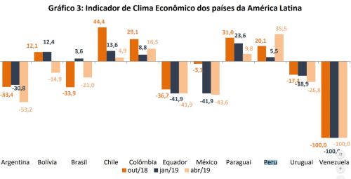 Según el informe, en Latinoamérica el ambiente para los negocios solo mejoró para Colombia (desde 8.8 puntos en enero hasta 16.5 puntos en abril) y Perú (desde 5.5 puntos hasta 35.5 puntos) y se mantuvo estable en Ecuador (41.9 puntos).