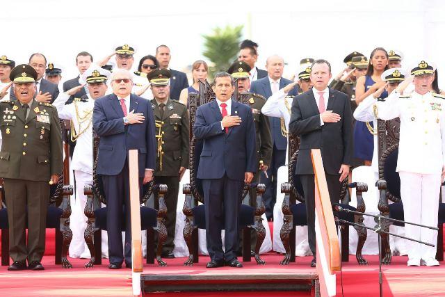 El presidente Ollanta Humala en la ceremonia acompañado de los comandantes generales de las Fuerzas Armadas y autoridades civiles.,