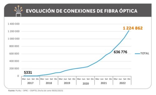 Al cierre del 2022, se reportaron 1 millón 224,862 conexiones de internet fijo con fibra óptica, lo que representó un avance del 92.35% respecto a similar periodo del 2021, cuando se registraron 636,776 conexiones, informó el Organismo Supervisor de Inversión Privada en Telecomunicaciones (Osiptel).