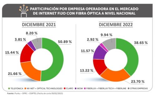 De este modo, a nivel nacional, Telefónica ocupa el primer lugar de participación de este mercado con 38.65 %, le siguen el grupo conformado por Wi-net y Optical Technologies (23.70%), Claro (13.22%), Wow (11.57%), el grupo conformado por Fiberlux, Fiberlux Tech y Fiberline (2.92%) y otras empresas (9.94%), detalló.